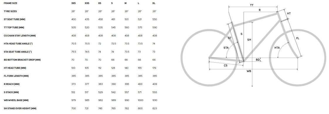 frame size 3XS, XXS, XS, S, M, L, XL