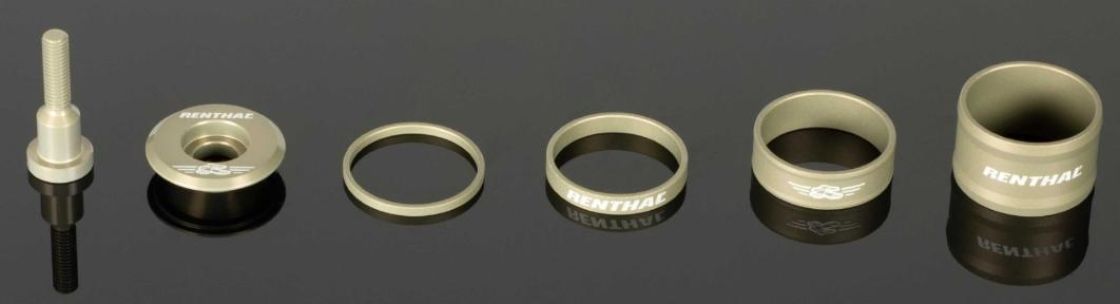 Aluminium top cap and Bolt. 2.5mm, 5mm, 10mm and 20mm aluminium spacers. Suit 1 1/8in steerer. Gold colour.